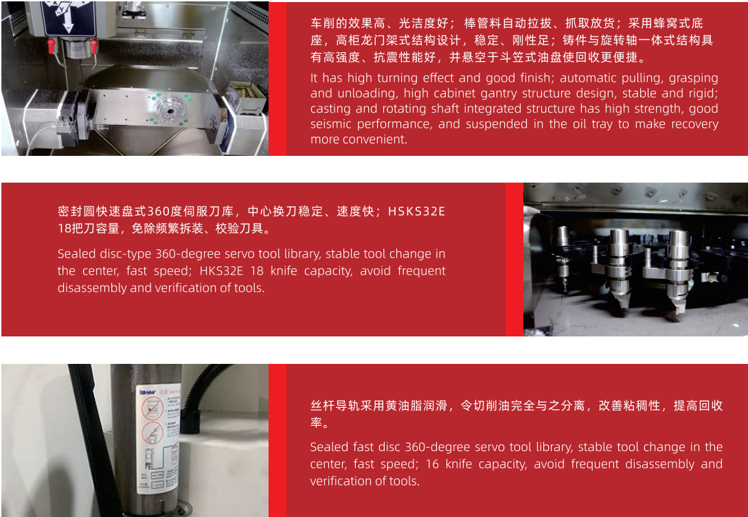 集五軸立體空間雕刻帶車削于一體;車削 的效果高、光潔度好;棒管料自動(dòng)拉拔、 抓取放貨, 一次性完成整根棒料的生產(chǎn), 省時(shí)省工;滿足各種弧度擺動(dòng)類產(chǎn)品需求。