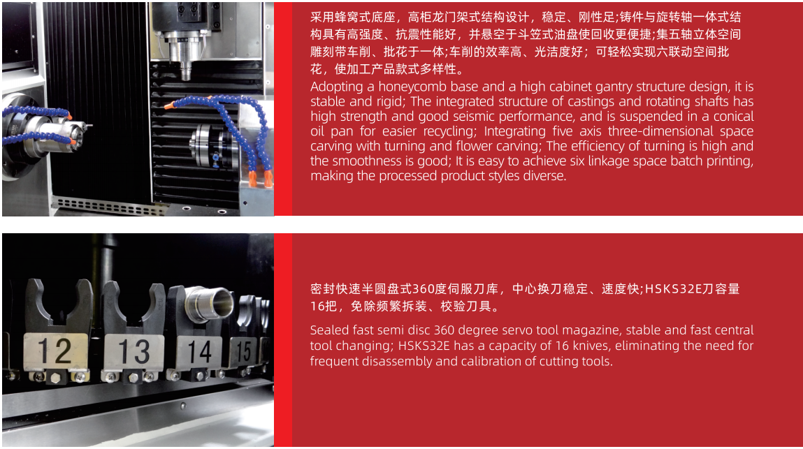 除具備數(shù)控五軸機(jī)床外的功能可輕松實(shí)現(xiàn)六聯(lián)動,替代傳統(tǒng) 工藝上難加工的螺旋紋、米字花、太陽紋等多樣款式;集五軸 立體空間雕刻帶車削于一體;車削的效果高、光潔度好;還可 快速完成平面銑削、鉆孔、攻絲、直槽、螺旋槽及銑齒等, 具有車削、銑削以及鏜削等復(fù)合功能,能夠?qū)崿F(xiàn)一次裝夾、 全部完工的加工理念。滿足大批量生產(chǎn);操作簡單方便,滿足 各種弧度擺動類產(chǎn)品需求。